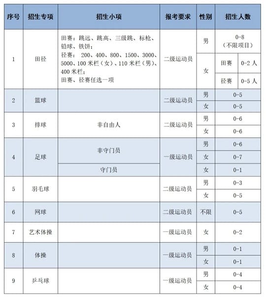 (六)田径、网球生源不均衡,优先在该两个项目中相互调整;篮球、排球、足球、羽毛球、乒乓球男女间生源不均衡,优先在该项目之中互相调整;艺术体操、体操生源不均衡,优先在该两个项目中相互调整,按综合分从高到低排序依次录取。